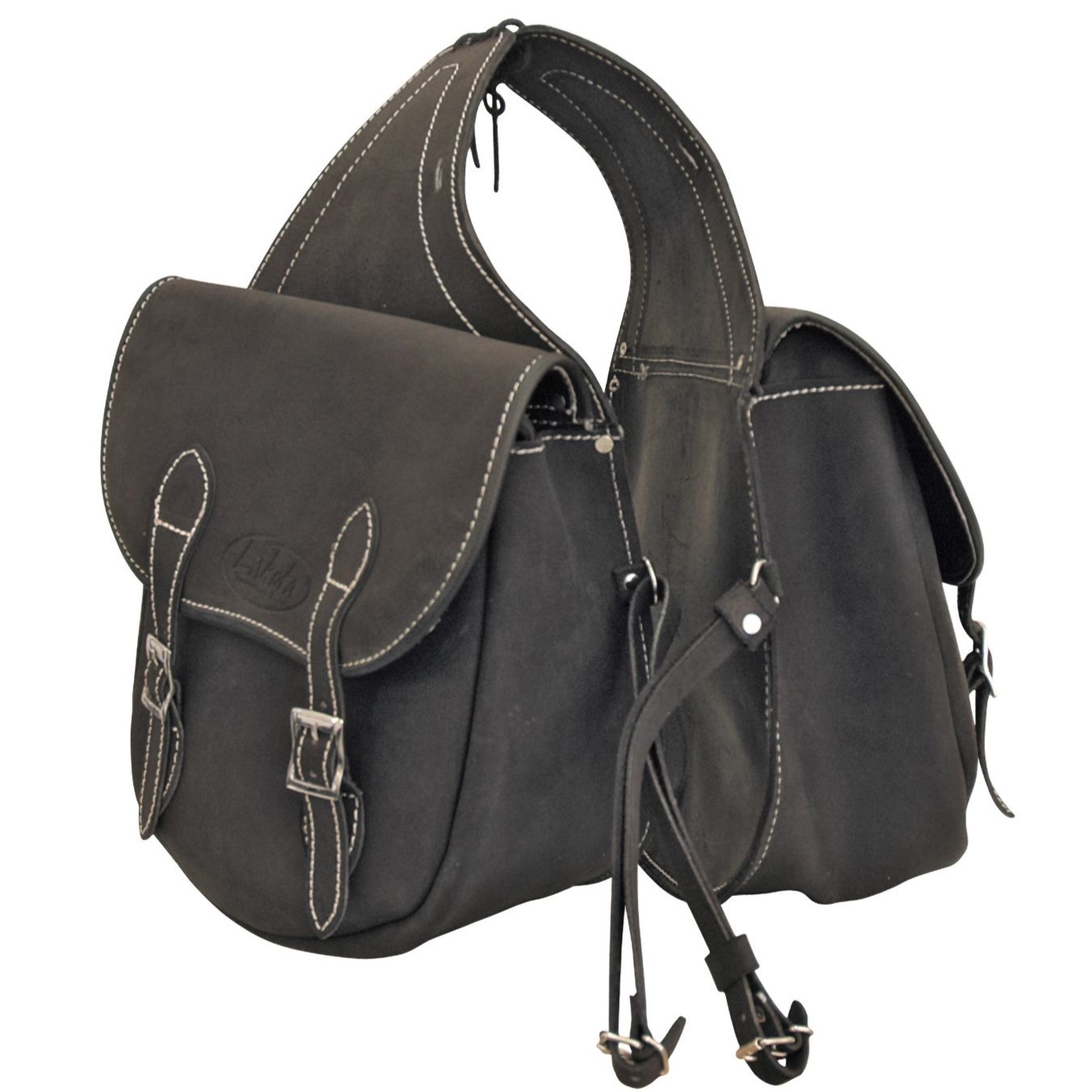 Bisaccia posteriore in Cuoio Scamosciato a 2 Tasche. La bisaccia รจ dotata di chiusure con laccetti con fibbie regolabili e laccetti in cuoio per attacco alla sella. Cuoio robusto e di qualitร superiore.