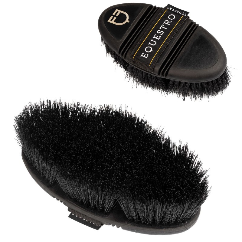 La spazzola รจ decorata con logo sul dorso e scritta Equestro sul cinturino elastico.