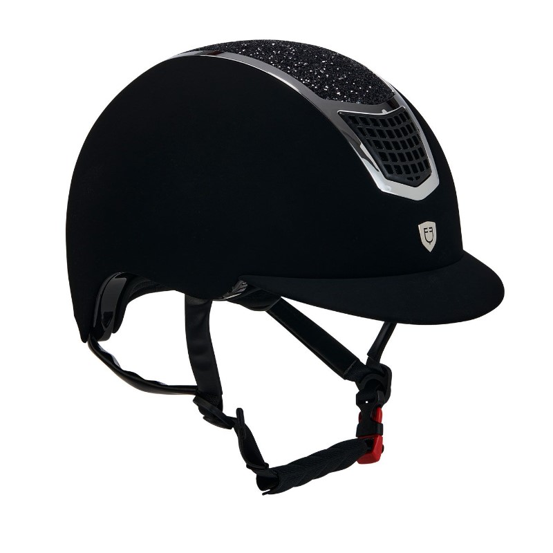 La calotta esterna รจ in velluto con prese dโaria frontali decorate con applicazioni di strass, profili lucidi e targhetta con logo Equestro per un design estremamente raffinato.