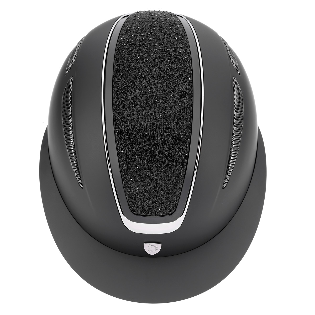 Cap Tattini modello Cassiopea realizzati con nuova placca con glitter e cristalli, profili lucidi in acciaio. Omologazione ce vg1, visiera larga piรน avvolgente ai lati, regolazione con strappo, doppie griglie di ventilazione laterali, fodera rimovibile e lavabile, regolazione micrometrica con rotella.