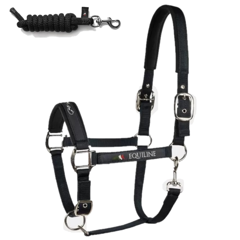 Cavezza Equiline modello Timmy regolabile in polipropilene con imbottitura in neoprene e logo โEquilineโ sui lati. Fibbia, moschettone e anelli in metallo. Lunghina abbinata Equiline.