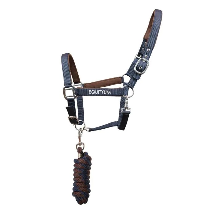 Cavezza Equityum ย modello โ€œZeldaโ€ inย nylon triploย offre unaย maggiore robustezza e durata, fibbie cromate, doppia regolazione ai lati piรน una sotto al mento. Pratica chiusura tramite moschettone. Dotata di interni in morbido pile. Completa di Lunghina.