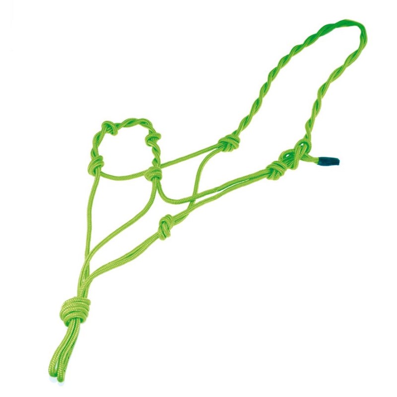 Cavezza in corda annodata con nodi sulla nasalina. La cavezza in corda offre una lunga durata nel tempo perchè priva di fibbie e moschettoni ed i nodi sulla nasalina garantiscono un maggiore controllo sul cavallo durante il suo utilizzo.