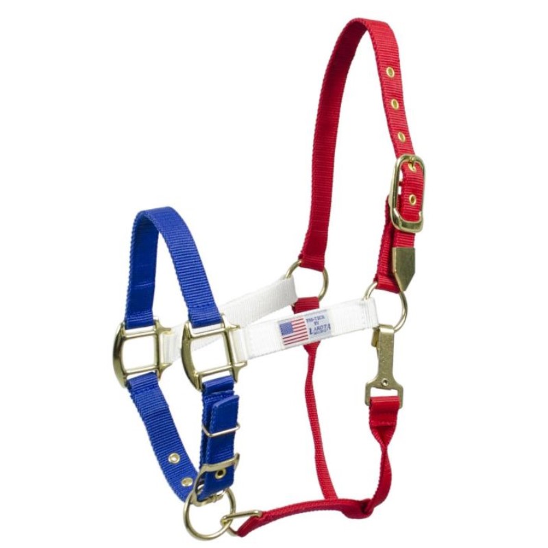 Cavezza in nylon rinforzato colorazione Tricolore USA è realizzata dalla Lakota con materiale di qualità superiore. Fibbie e moschettoni rinforzati con doppia regolazione.