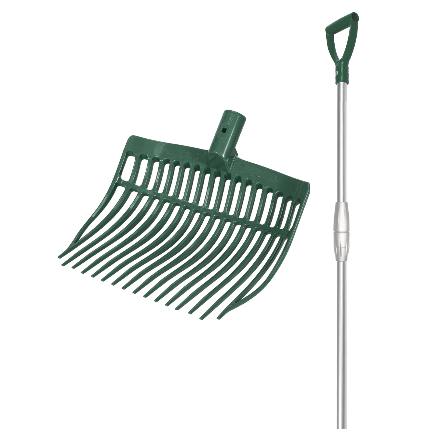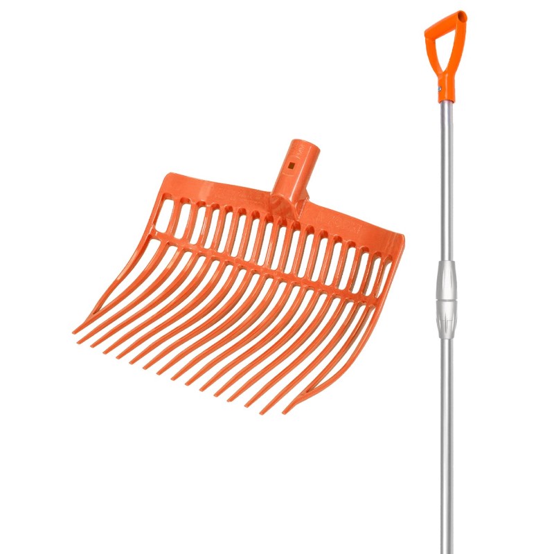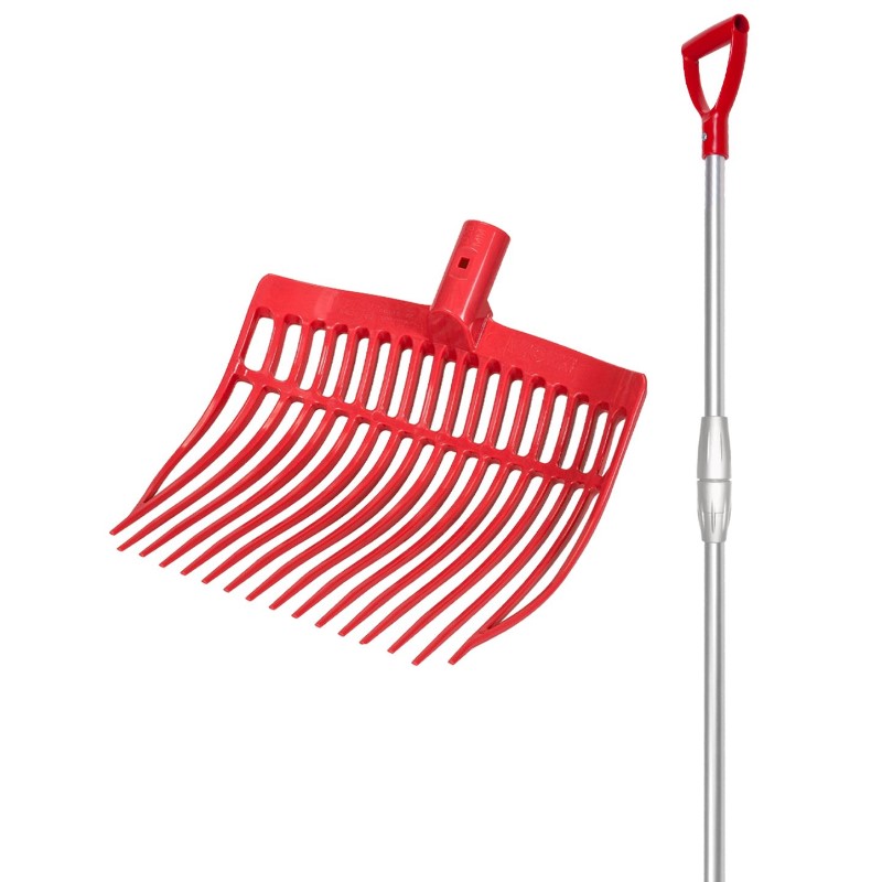Forca arrotondata realizzata da V-PLASTย  semicurva in plastica resistente con denti flessibili con manico TELESCOPICO alluminio confezione in cartone con manico e forca. La forca grazie alla sua leggerezza offre una praticitร  e comoditร  durante la pulizia del box o scuderia.