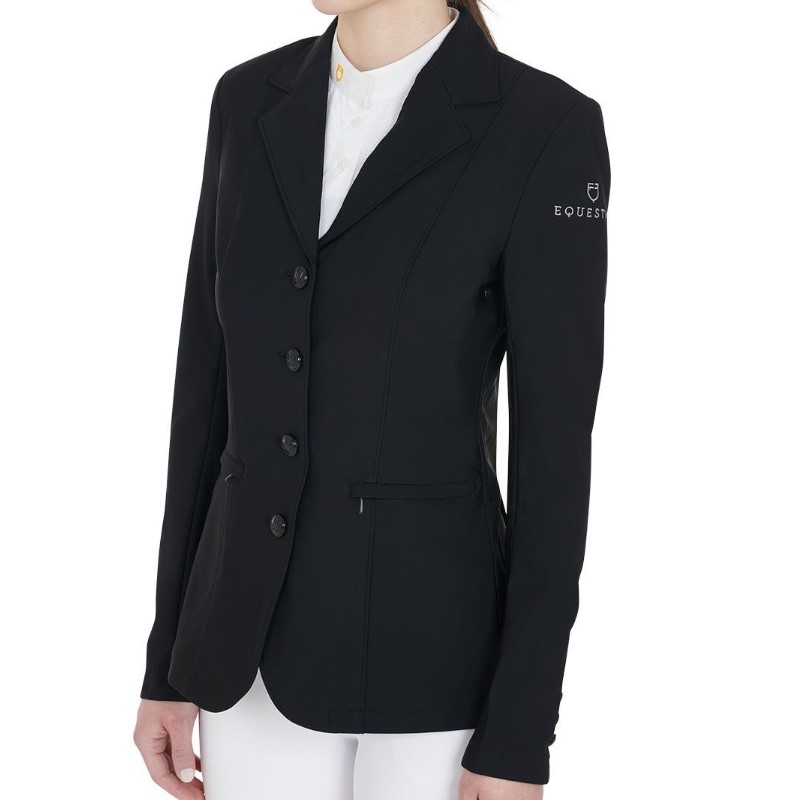 Il design del modello Active è studiato per garantire un taglio anatomico. La giacca si adatta perfettamente alla figura femminile e valorizza la postura in sella. Presenta quattro bottoni frontali, tasche con chiusura a zip e il logo Equestro ricamato sulla spalla, dettagli che uniscono funzionalità ed estetica. Di conseguenza, il capo mantiene un aspetto ordinato e professionale durante ogni competizione.