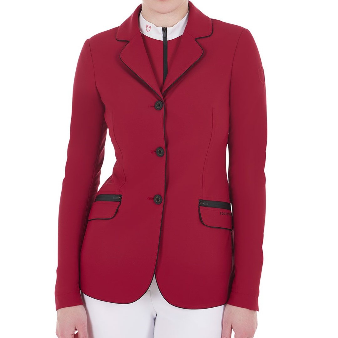 Giacca Equestro da donna, tre bottoni, taglio classico, con inserti a contrasto. Tasche frontali a soffietto con zip antivento e impermeabili e polsini con chiusura a tre bottoni.