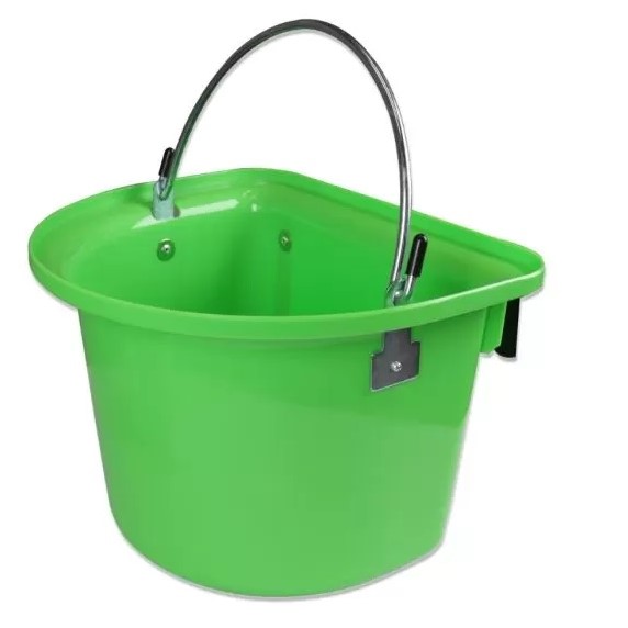 Mangiatoia in plastica con manico e staffe in metallo. La mangiatoia con staffe è un’ ottima comodità per il trasporto di mangime o acqua nei box o paddock, e soprattutto durante le competizioni , le staffe posso essere applicate facilmente ovunque fuori negli spazi aperti.