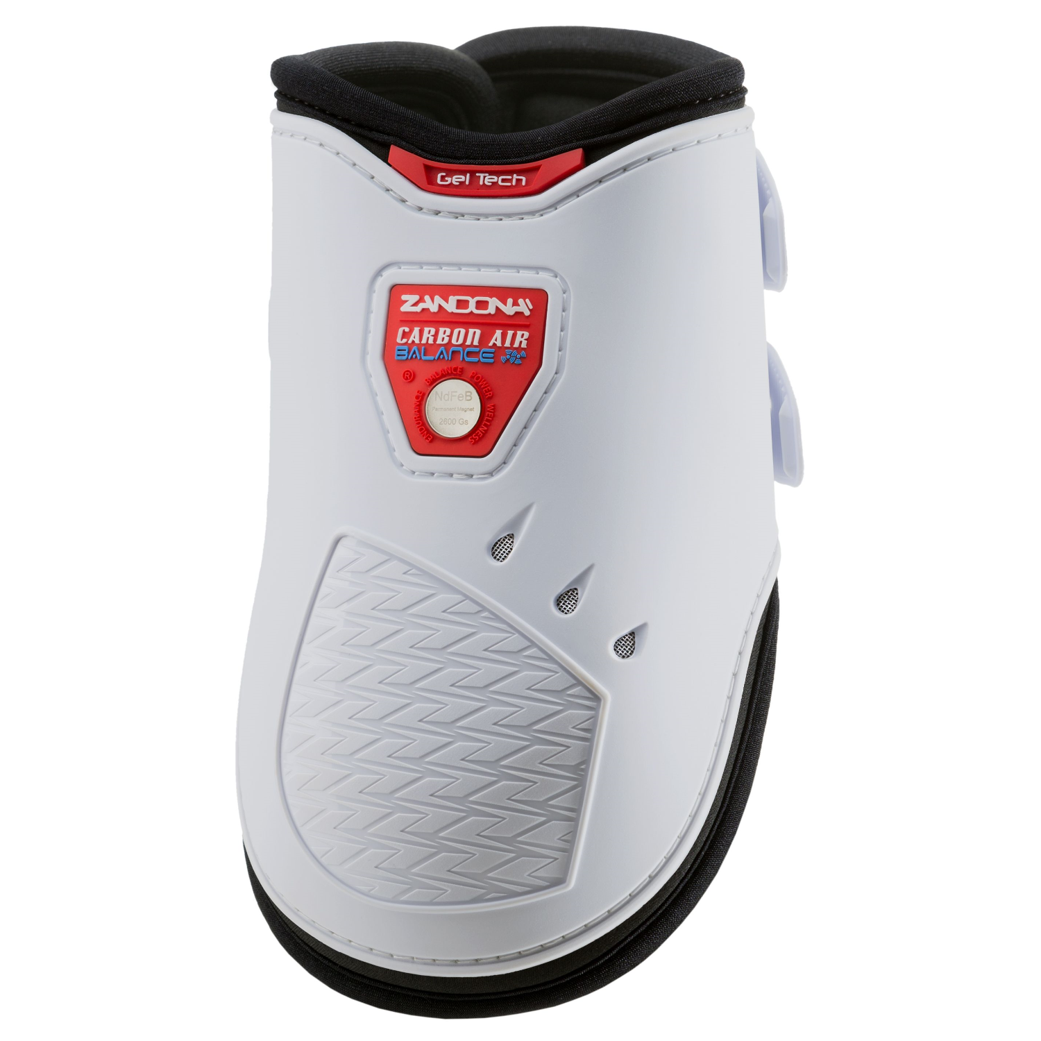 Le paranocche “CARBON AIR BALANCE Fetlock”, sono provviste di un dispositivo magnetico che migliora le funzioni cellulari, aumentando la performance e l’equilibrio dinamico del cavallo. Il magnete permanente utilizzato è composto da una lega fortemente magnetica di Neodimio, Ferro e Boro con rivestimento in Nichel, in grado di esercitare un’induzione magnetica di ben 2600 Gauss. E’ stato riscontrato, in vari test condotti con la collaborazione di veterinari e cavalieri professionisti, che l’uso di questo dispositivo collocato in prossimità dell’apparato muscolo-tendineo diminuisce sensibilmente l’affaticamento dell’arto in quanto induce un aumento della portata sanguigna vascolare e della circolazione linfatica, con molteplici effetti benefici.