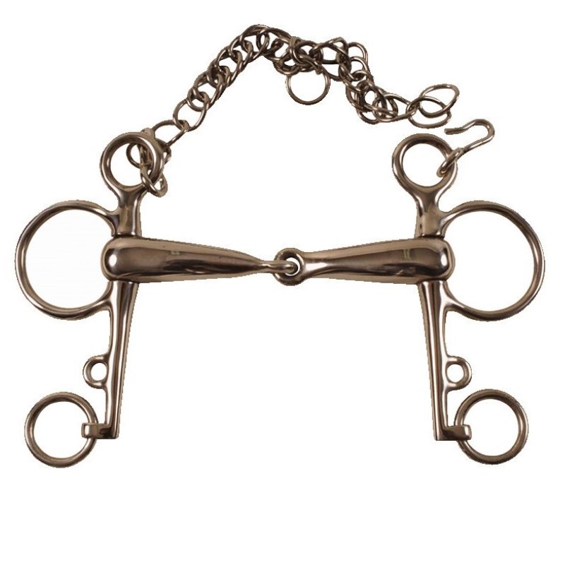 Phelam snodato con imboccatura vuota, completo di barbozzale. Il phelam è un’ imboccatura molto utilizzata nelle discipline inglesi e spagnole, la sua funzione è molto interessante perchè grazie agli anelli posizionati sulle aste permette di alloggiare le redini in due posizioni differenti oppure da la possibilità di utilizzare due paia di redini in contemporanea grazie proprio ai due anelli.