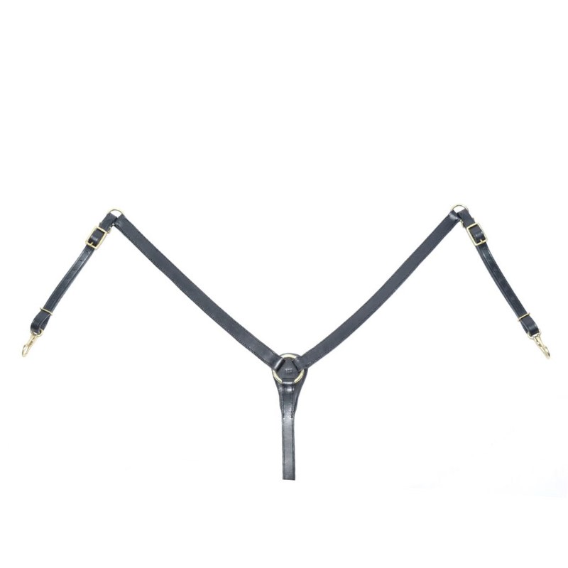 Pettorale inglese in cuoio liscio realizzato con cuoio robusto e rinforzato, dotato di moschettoni e doppia regolazione su entrambi i lati nellโ€™ attacco per sella e regolabile nella parte inferiore attacco per sottopancia.