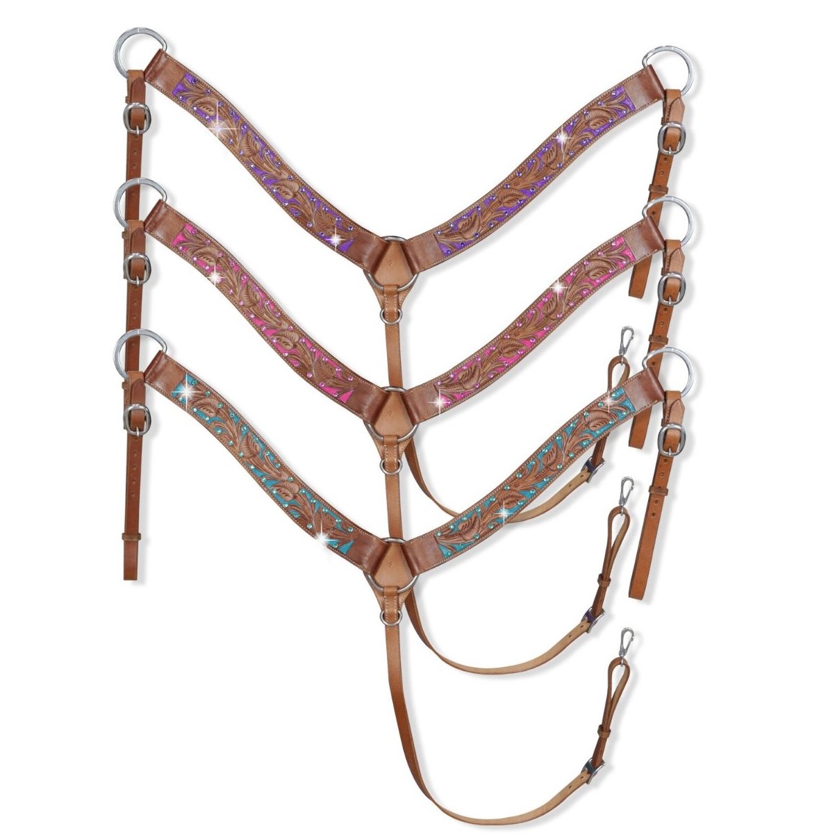 Pettorale western modello Georgia in cuoio con lavorazione western e strass. Il pettorale è realizzato interamente in cuoio con riporti colorati.