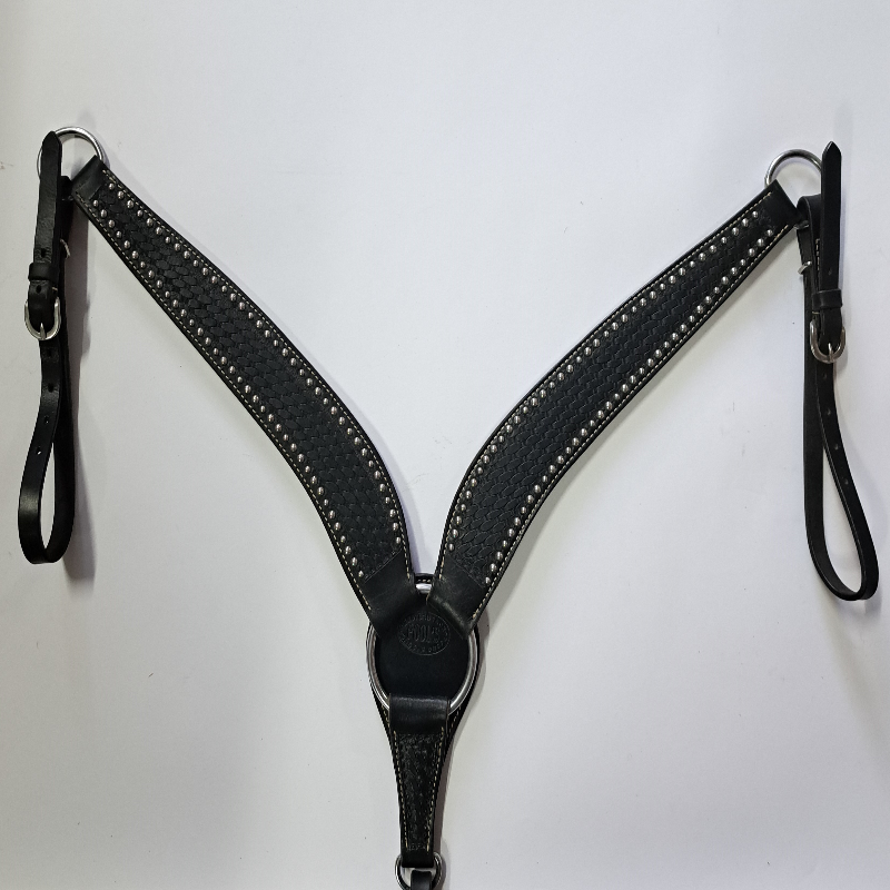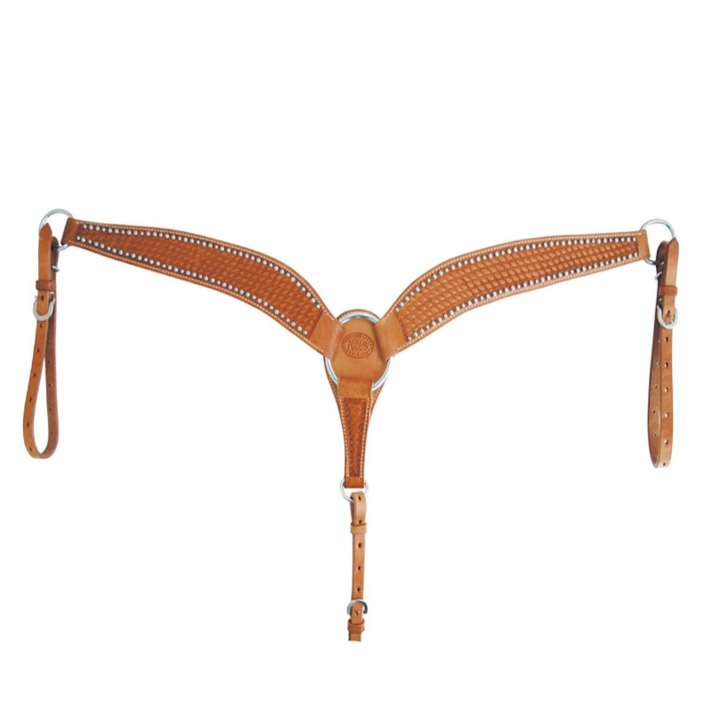 Pettorale western Pool’s in cuoio robusto con lavorazione basket tipica western, inserti spots in acciaio inox, modello largo. Il pettorale western Pool’s realizzato con cuoio di qualità superiore offre una lunga durata nel tempo, affidabilità per la sicurezza nel tenere la sella ed inoltre la lavorazione basket offre un vero stile western. Fibbie e moschettoni in acciaio inox. Si consiglia di utilizzare l’ olio per cuoio durante la pulizia del cuoio con un pennello.
