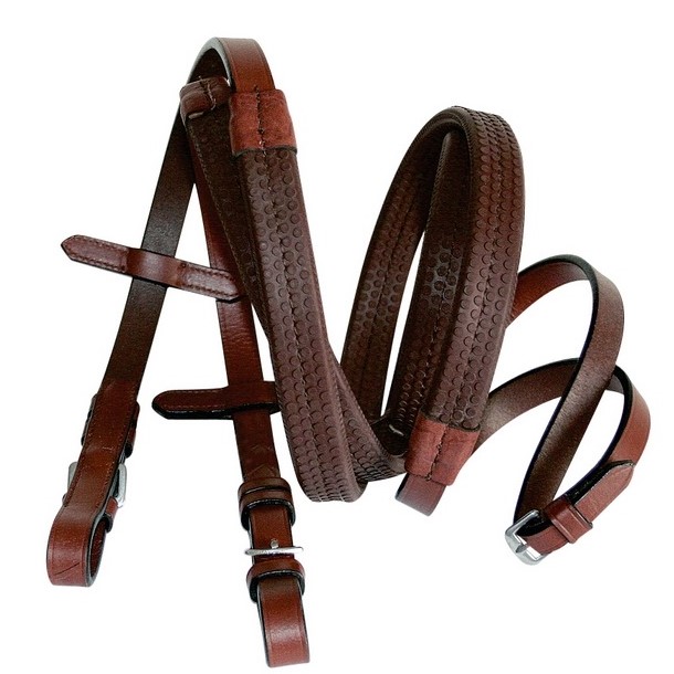 Redini inglesi di qualitร  superiore in cuoio ricoperte con impugnatura in gomma antiscivolo. Fibbie in acciaio inox. Le redini sono dotate di olivette.