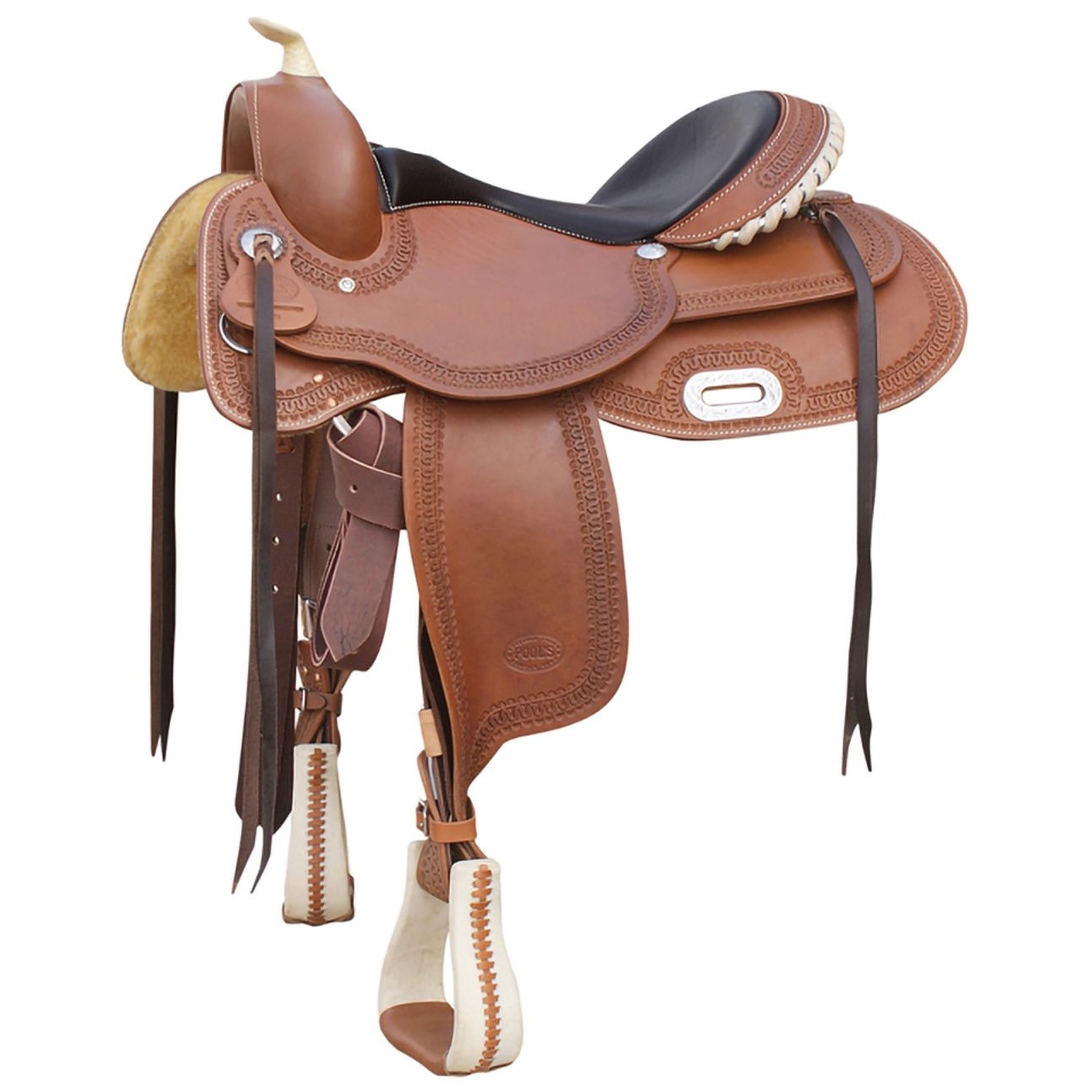 Sella Western Pool’ s modello Reiner con riporti in rawhide, cuoio ingrassato, arcione flessibile, seggio in pelle e lavorazione border stamp.