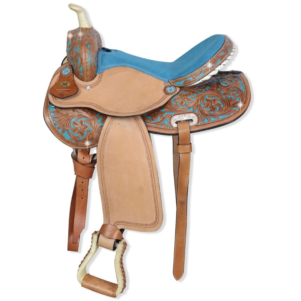 Sella western Silver Horse modello Georgia in cuoio lavorata flowers. La sella oltre ad offrire uno stile western sportivo offre un’ ottima comodità e stabilità in sella grazie al suo seggio in pelle scamosciata ed ai fender in cuoio rovesciato. La sella è dotata di riscontri anteriori e posteriori in cuoio e sottopancia anteriore a cordoncini e posteriore in cuoio. La sella è arricchita da strass in tutte le sue parti e seggio con rawhide.
