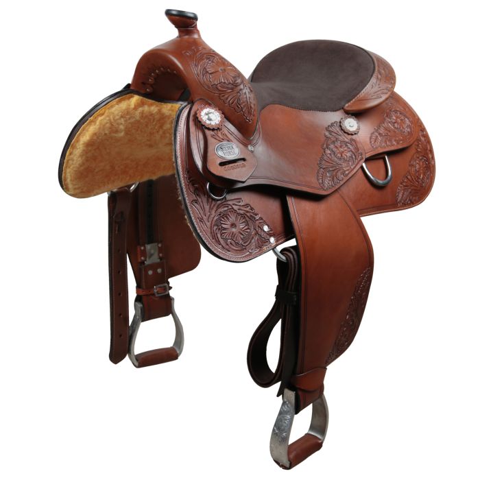 Sella western Silver Horse modello Reiner in vero cuoio di qualitร superiore. La sella offre una seduta molto comoda con seggio in pelle scamosciata. Lavorazione flowers in tutte le sue parti tipiche western. Sella tipica da reining e per il trekking. La sella รจ dotata di riscontri anteriori in cuoio con sottopancia a cordoncini e posteriori in cuoio con sottopancia in cuoio. Staffe western di qualitร superiore in alluminio.