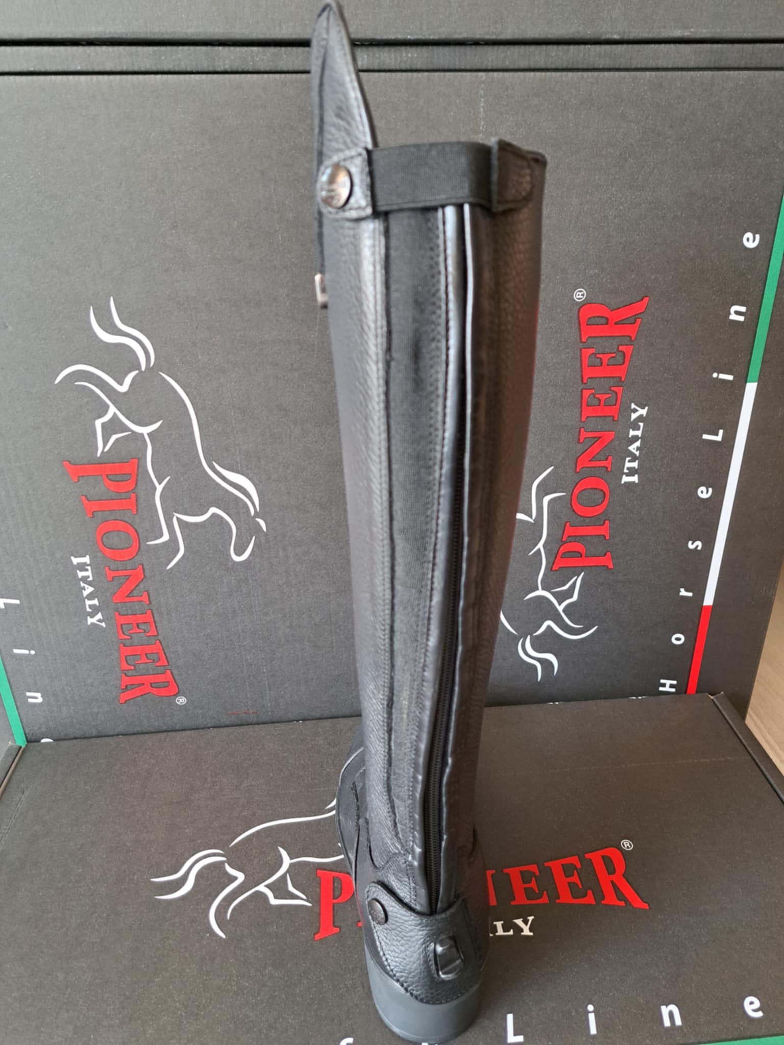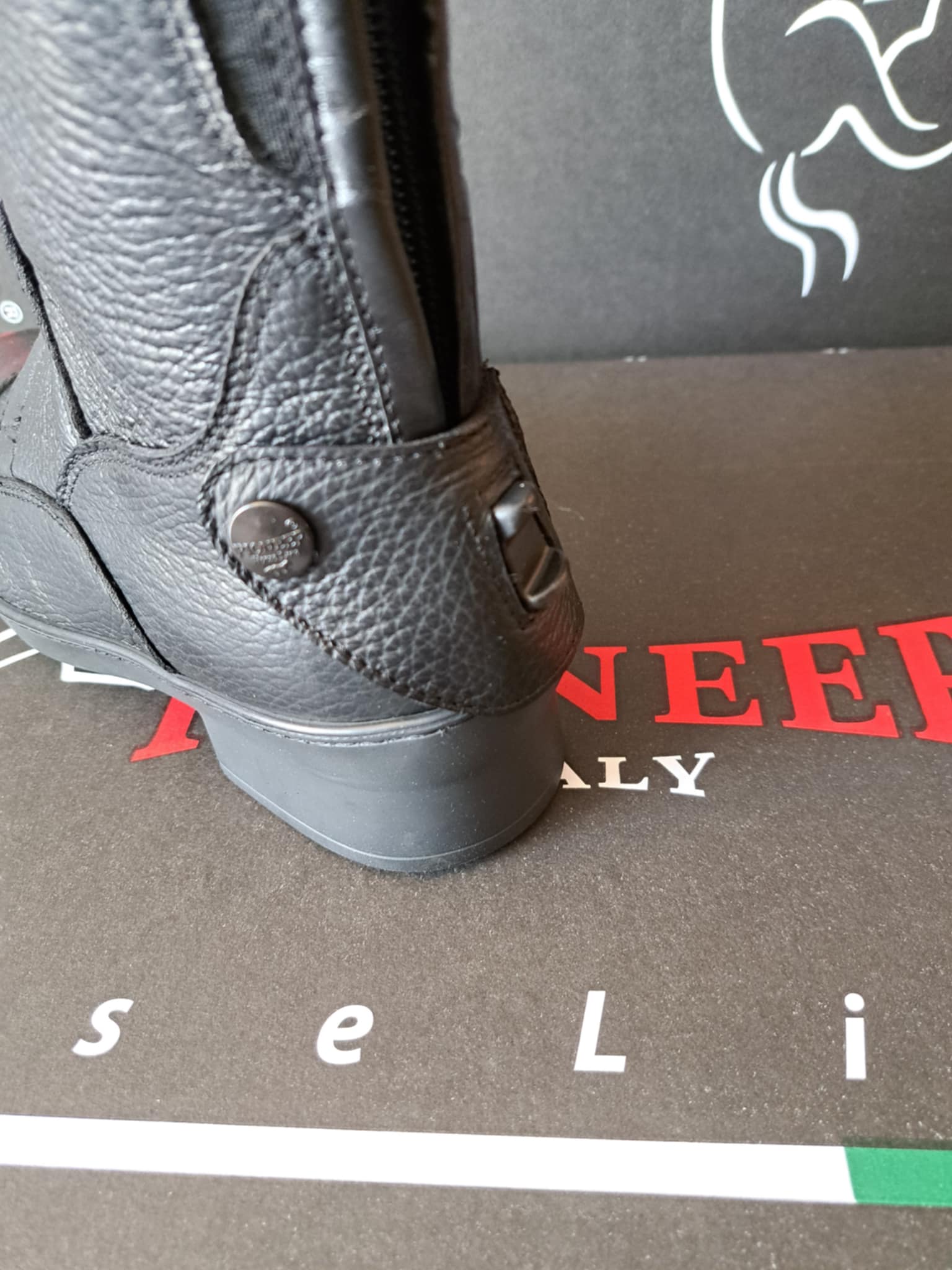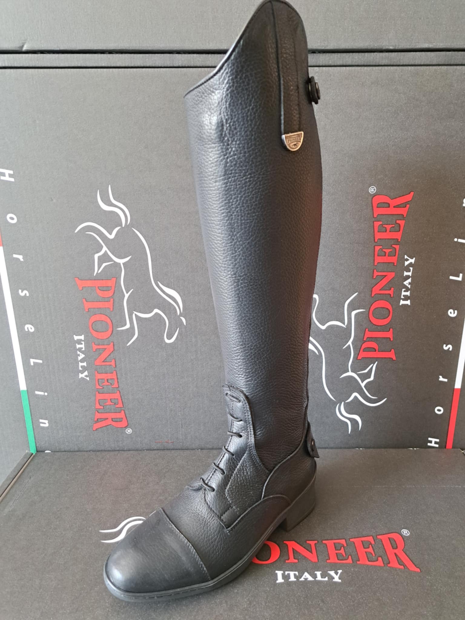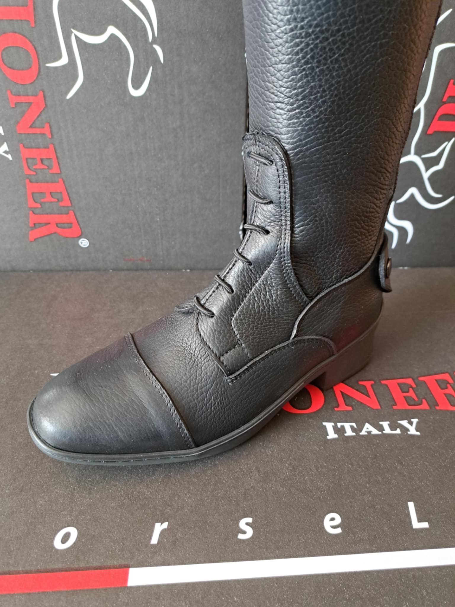 Stivali in Pelle Pioneer in pelle modello Afrodite con Laccetti. Gli stivali Pioneer sono realizzati in pelle morbida martellata di qualitร  superiore con realizzazione e lavorazione MADE ITALY. Gli stivali hanno una chiusura posteriore con zip, supporto elastico lungo il polpaccio e chiusura salva zip con porta-sperone posteriore. Suola in gomma antiscivolo ed ammortizzante. Offrono unโ€™ ottima vestibilitร  e sono comodi per gli allenamenti quotidiani ed ottimi per le grandi occasioni equestre. Dotati di laccetti sulla monta del piede per un maggiore comfort.